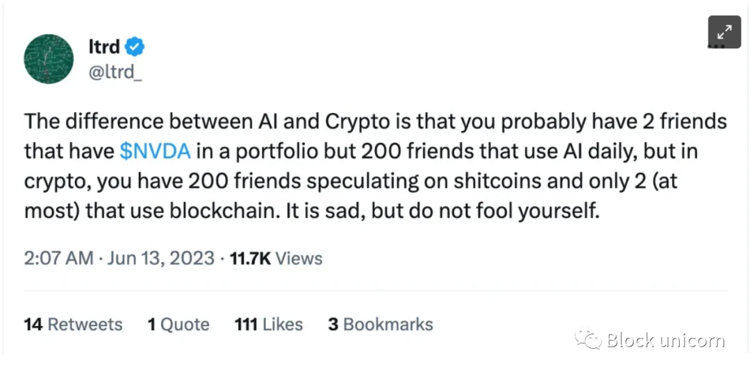 如上述用户在 Twitter 上指出的,AI 和加密货币之间的区别在于有多少人使用底层技术。反转代币持有者和产品用户之间的关系的一种方式,是查看社交产品,其中不需要代币就能与产品交互。