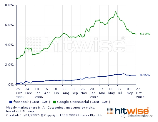 这个战略曾经一度奏效,如下图所示。到 2007 年底,OpenSocial 的应用网络流量是 Facebook 的五倍。2008 年,该网络上有 3.5 亿用户,但到 2010 年代,人们逐渐意识到开放的社交关系网络并不符合互联网的愿望。就像 2022 年的 Libra 一样,一个由大型组织以非营利方式合作的项目,往往会被行动快速的小团 队打败。