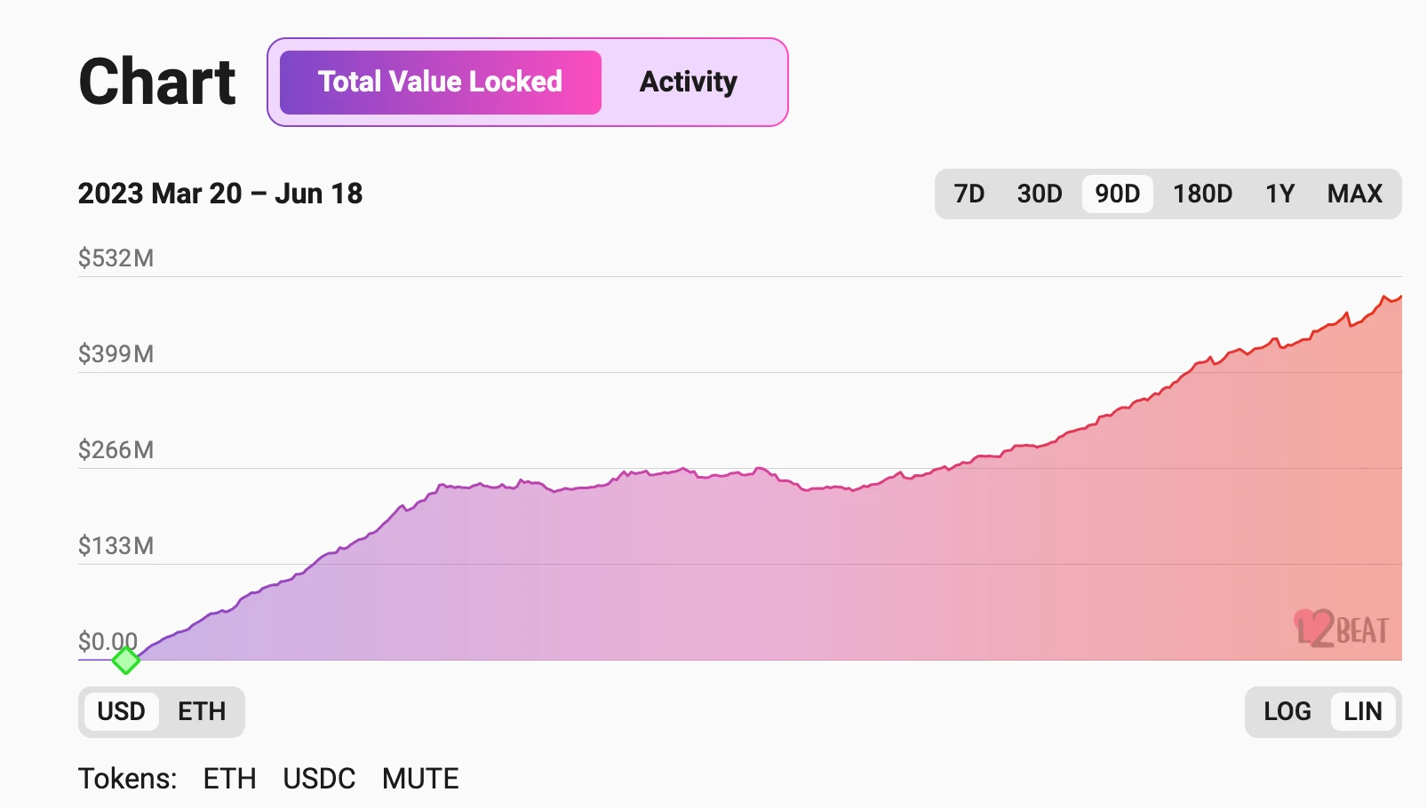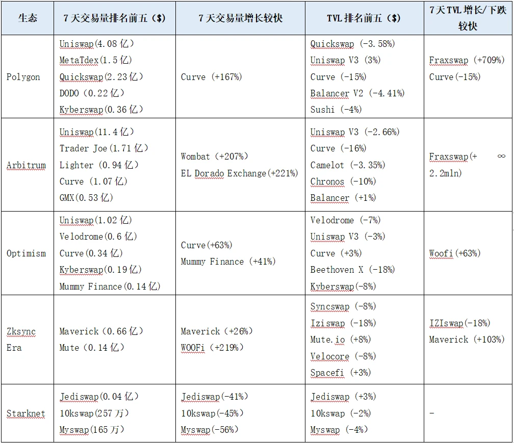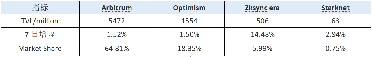 Arbitrum、optimism、Zksync era、Starknet TVL 较上周均有回升,其中依旧是 Zksync era 涨幅最为强劲,较上周上涨 14.48% 。Zksync era TVL 连续上涨已超过一个月,TVL 总量到达 optimism 的三分之一。