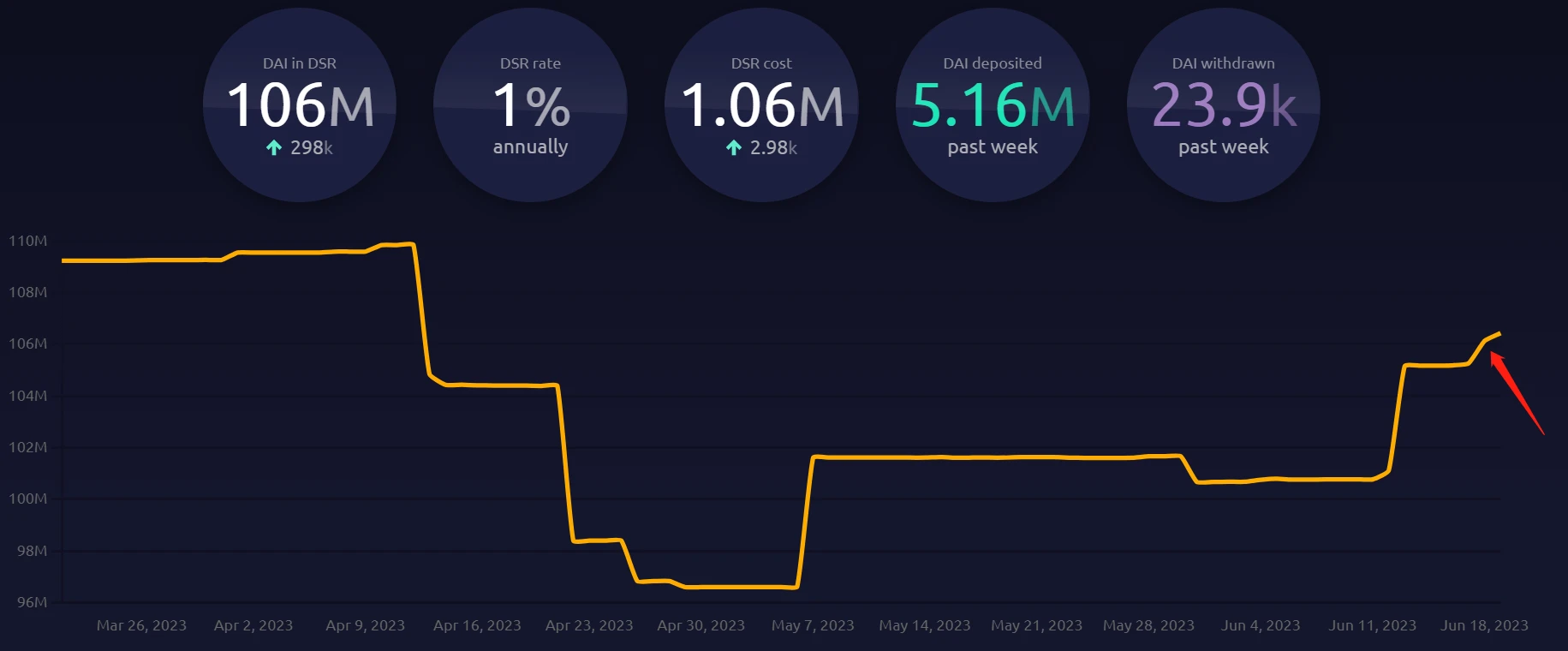 自 Maker 官方发布消息以来,DSR 内 TVL 增加 100 万枚左右,过去一周存款达到 500 万枚,取款 2.3 万枚。