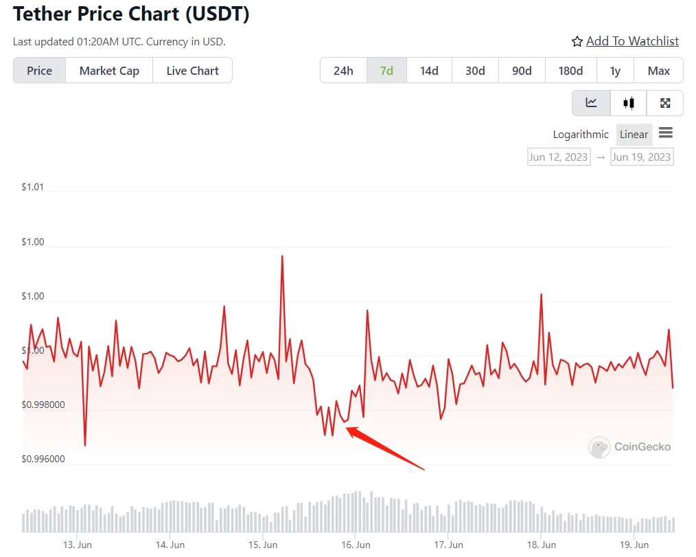 2 ) 6 月 15 日,USDT 发生短暂脱锚, 根据@look on chain 链上监控数据显示,鲸鱼“0x 3356 ”创建了一个新地址,在 Aave 和 Compound 上存入 5, 250 万美元 USDC 并借入 4, 000 万美元 USDT,之后他将 4, 000 万美元的 USDT 存入 Coinbase 和 Kraken,之后 USDT 开始脱锚。在将 USDT 存入中心化交易所 4 个小时后,他又从 Coinbase 提取了 2, 500 万美元的 USDC。