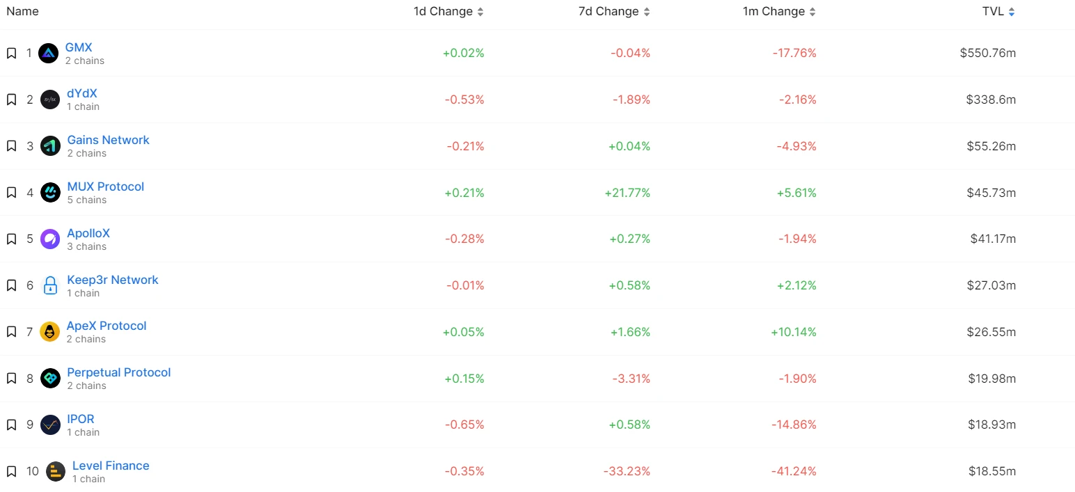 本周 TVL 略有回升。 SEC 监管事件暂告一段落后,此前从 DeFi 协议中退出的资金重新进入。变化比较大的协议是 MUX Protocol 和 Level Finance。MUX TVL 本周增长 21.77% ,Level 降低 33.23% 。收益率可能是影响因素之一。MUXLP APR 约为 28% ;Level 的低风险池收益率约为 14% ;GLP (Arbitrum)的收益率为 10% 。
