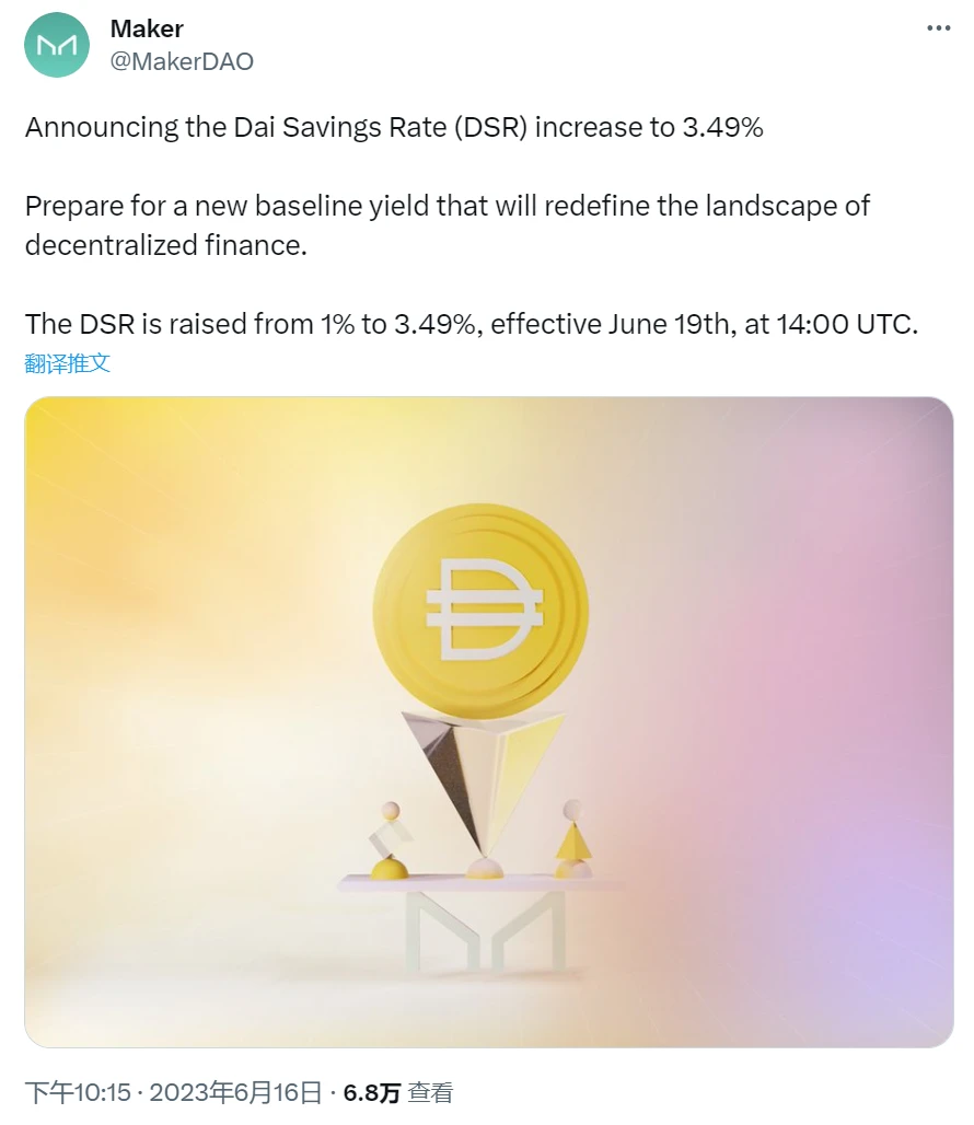 3 ) Maker 将其 DAI 存款利率(DSR)从 1% 提高至 3.49% , 6 月 19 日正式生效。 此次利率上调对于 Maker 来说是比较大的一次调整,不仅是存款利率本身的一次大幅度上调。