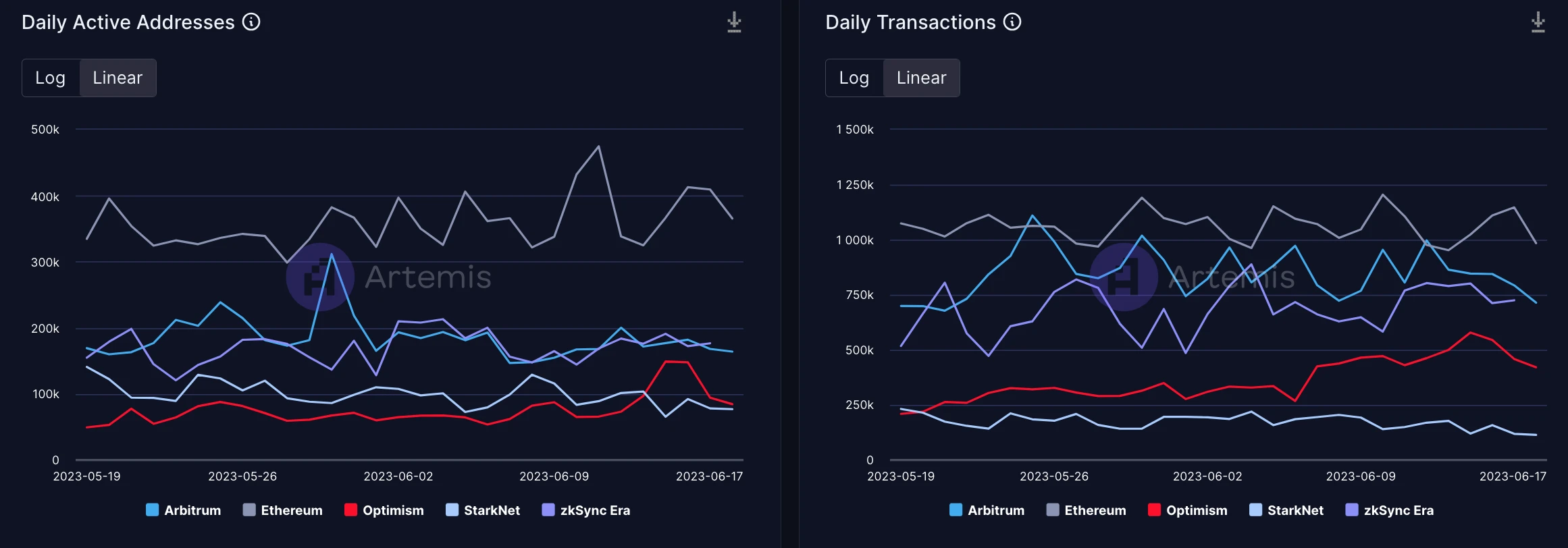 近期链上活跃度总体都有所回落 ,排序上依旧是 arbitrum > zksync era > optimism > Starknet。