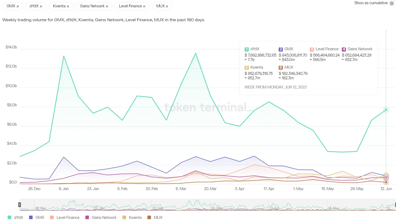 上周(6 月 12 日至 6 月 18 日)衍生品 DEX 的整体交易量较此前一周有所上涨。6 个主要衍生品 DEX 协议的周交易量约为 120 亿美元,涨幅约为 20% 。 从周交易量变化趋势看, 5 月中旬到 6 月初,是 2023 年交易最为冷清的两周。