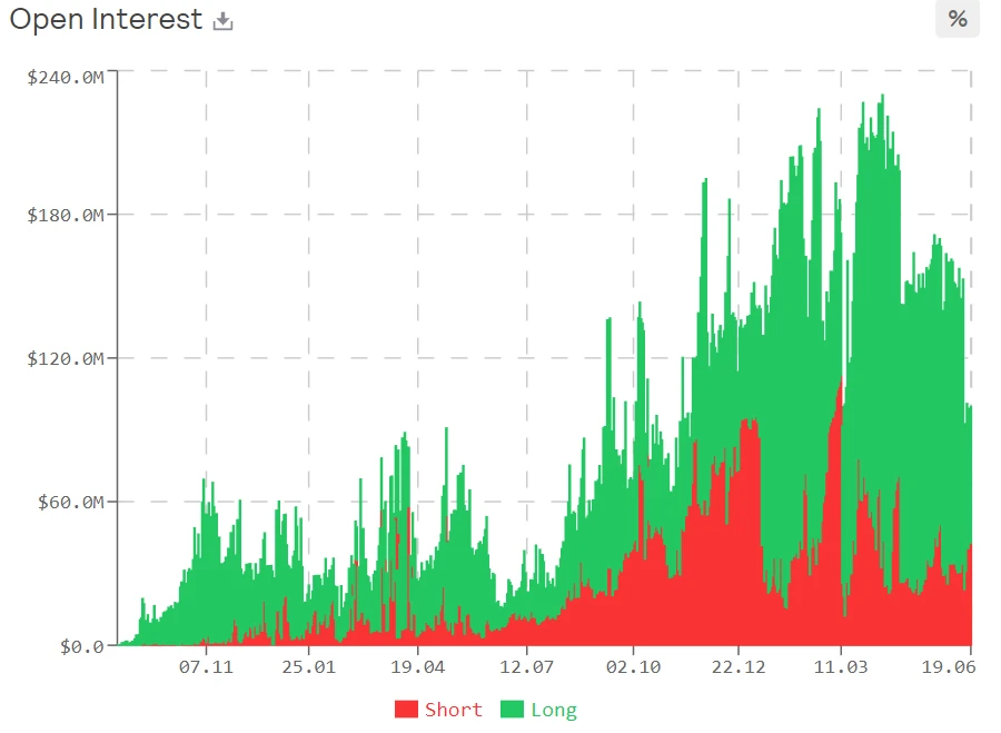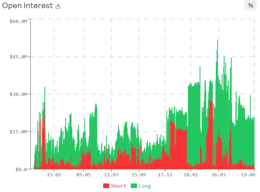 从持仓量看,GMX 的持仓量处在下降趋势中。 峰值出现在 2023 年 3 月中旬到 4 月中旬,峰值超过 2.5 亿美元。自 4 月下旬以来进入下降趋势,最近一周持仓金额约为 1.1 亿美元,与 2022 年 11 月中旬水平相当。
