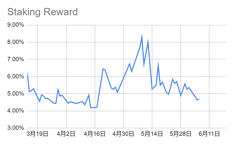 上周 ETH 质押率上涨至 19.15% ,环比增长 0.09% 。 上周有 2302.20 万枚 ETH 锁定在信标链中,对应质押率 19.15% ,环比增长 0.09% ;其中已参与节点质押的 ETH 62 万枚,环比增长 1.67% ,进入队列 9.14 万枚,环比下降 1.50% ;其中上周监管对 ETH 质押的不利影响持续发酵,Coinbase 继续出现大量解质押,一周 ETH 质押量下降 0.29% ,目前信标链退出队列已出清。