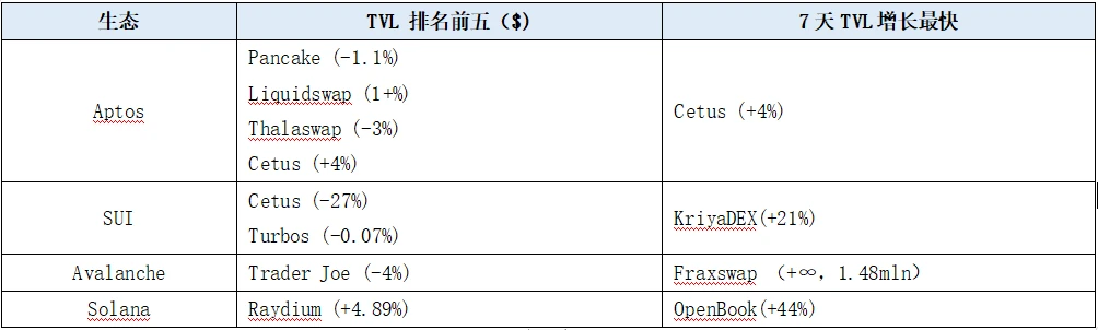DEX :Dex 合并 TVL 达到 151 亿美元, 较上周减少 4.5 亿美元。Dex 24 小时交易量 15.3 亿美元, 7 天交易量 172.5 亿美元, 较上周减少 16.4 亿美元。由于 Frax Finance 拟推出以太坊 Layer 2 网络 Fraxchain,Frax Swap 在 Polygon、Arbitrum、Avalanche 等几条链上的 TVL 增幅明显。