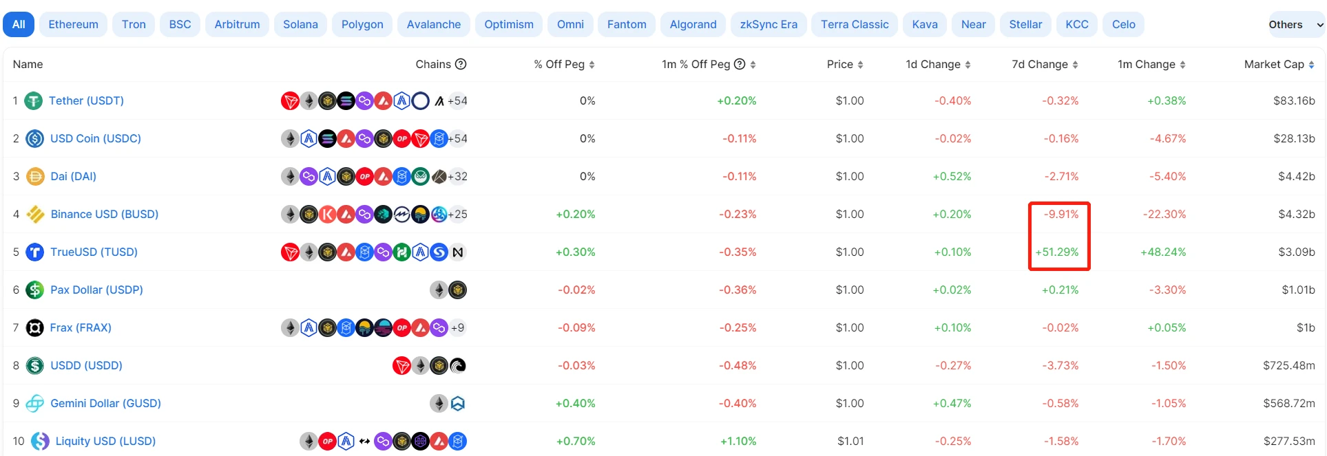 依据 defillama.com 数据显示,目前稳定币板块总市值约 1, 283 亿美元,相较上周仅有 0.1% 的下滑。主流稳定币中 BUSD 因受 SEC 对币安的指控影响,仍有较大幅度下跌。同时,币安官方公告完成 TrueUSD(TUSD)于 BNB Smart Chain(BEP 20 )的合约置换,币安地址在波场链上铸造 10.7 亿枚 TUSD。 TUSD 目前市值为 30.09 亿美元,一周上涨 51.29% 。