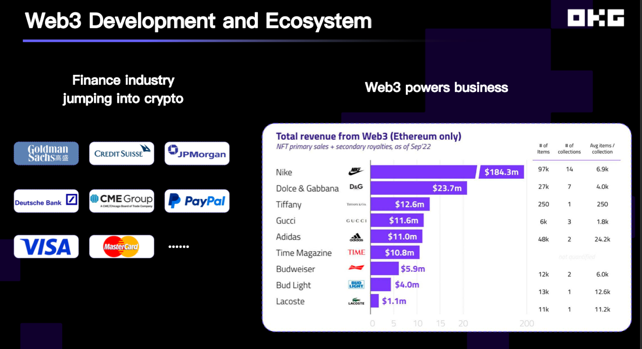 Web3行业正以40%以上的复合年均增长率(CAGR)蓬勃发展,这一增长速度是资产管理行业的4倍,也是互联网(软件服务)行业的近2倍之高。在充满不确定性的宏观局势下,高增长行业自是成了众多商业巨头以及金融行业的目标市场,例如耐克在2022年就以一个Web3领域的创新尝试为公司赚取了约1.84亿美元的收入。金融机构也在跃跃欲试:JP Morgan旗下区块链公司Onyx于去年年底推出四款产品,其中Coin Systems可在许可分布式账本上实现多银行、多币种资产的即时转移和清算。