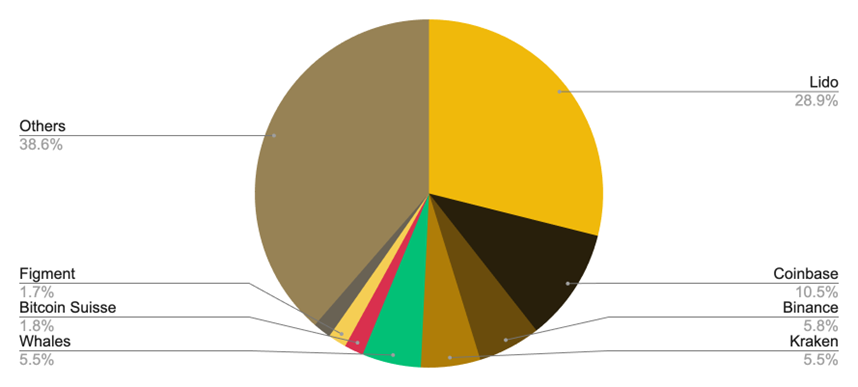 看看今天的整体 ETH 质押情况,Lido 是市场最大的参与者,占有 28.9% 的市场份额。接下来是像 Coinbase,Binance 和 Kraken 这样的中心化交易所。还有一些较小的流动质押提供者,但他们的质押 ETH 的份额要小得多。
