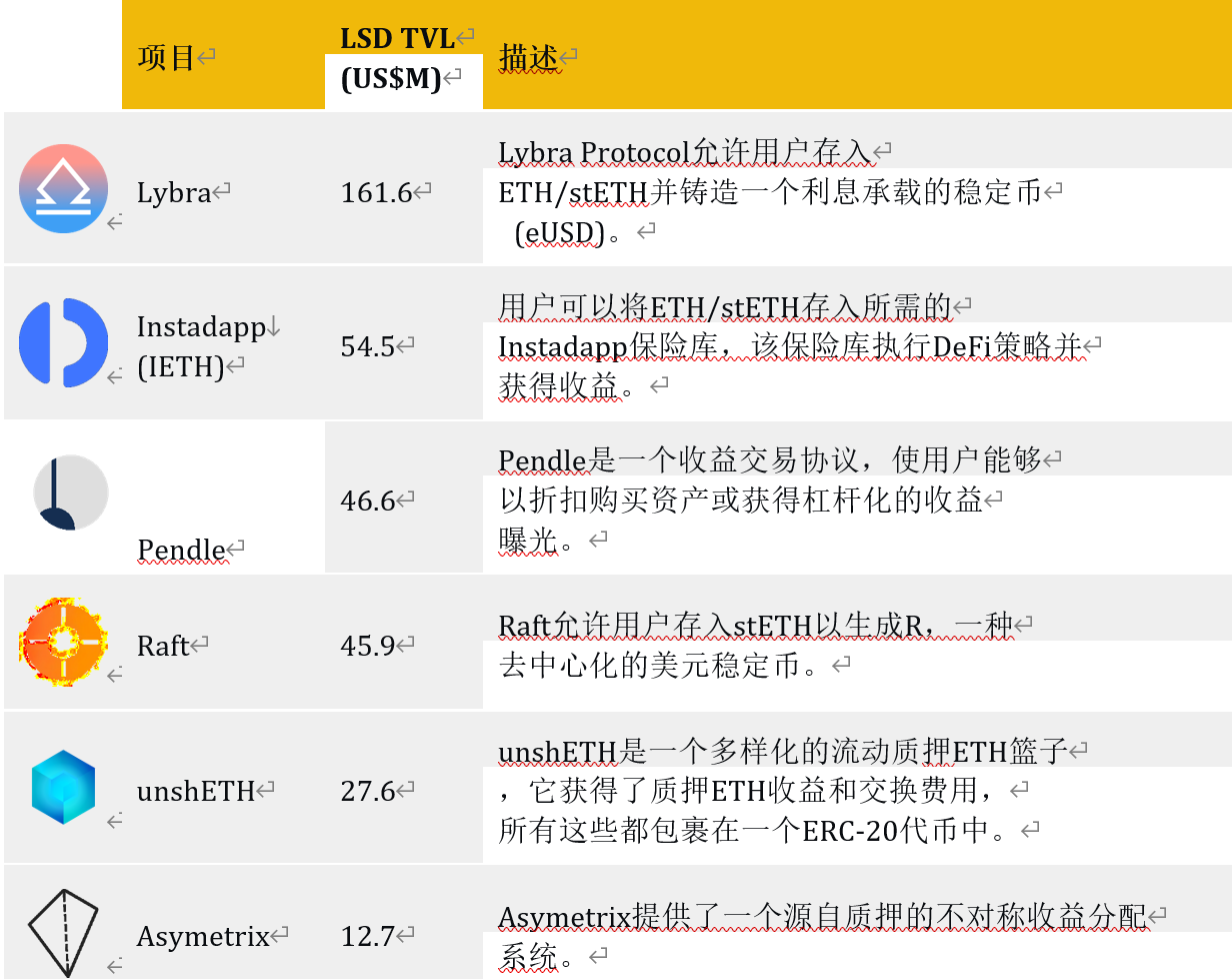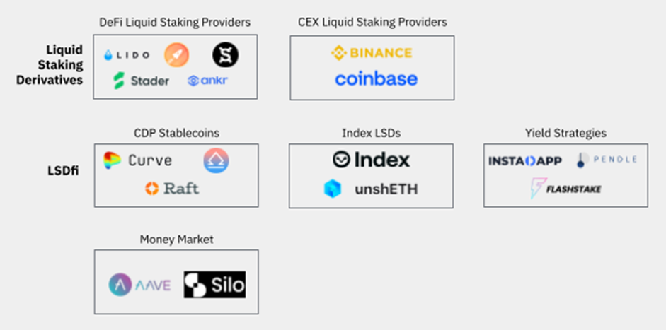 LSDfi 生态系统包括一些已经将 LSD 作为其多样化产品套餐的一部分的成熟 DeFi 协议,以及一些主要基于 LSD 的最新项目。