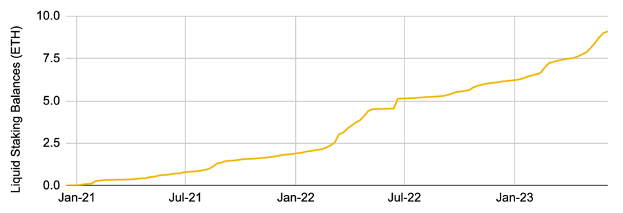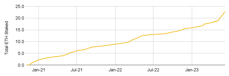 以太坊成功转向权益证明(“PoS”)以及 Shapella 升级后启用的质押 ETH 提现,都为质押的大量增长做出了贡献。