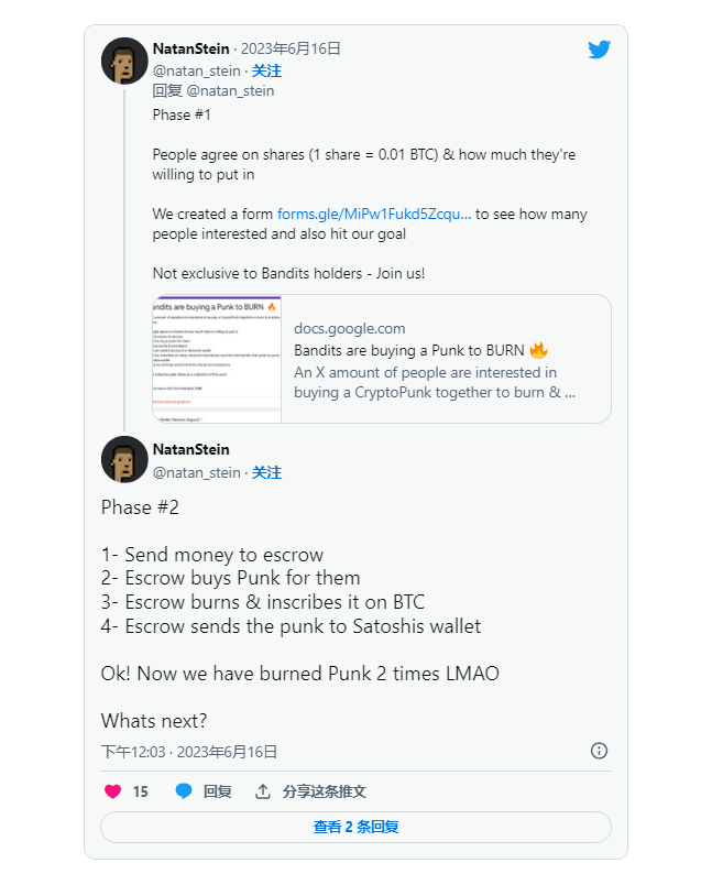 该项目的一位发言人告诉Decrypt,有效销毁 CryptoPunk #8611 的决定是由社区主导的努力,由 Wolf Capital 开发人员Nathan Stein在 Twitter 上和比特币 Bandits的持有者进行,Bitcoin Bandits 是西方主题的序号铭文集合。