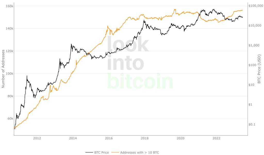 与此同时,拥有超过10枚比特币的地址也突破了自2019年9月以来的最高水平。