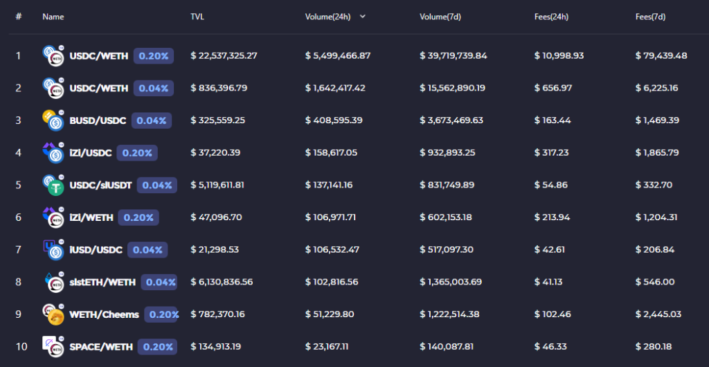 与 Syncswap 类似,iZiswap 的 ETH-USDC 交易量占比更加极端,两个 Pool 的交易量占到了日总交易量的 85.8% ,其次是稳定币和自有代币 IZI。