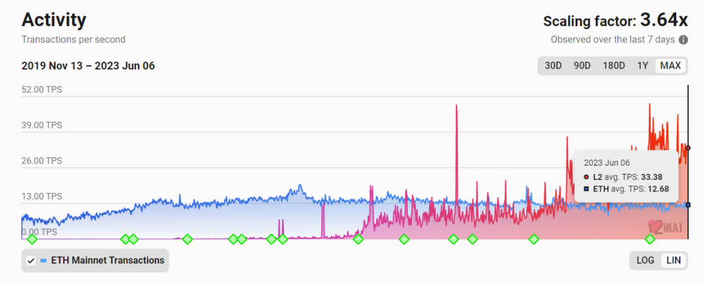 除了链上资金之外,链上的活跃数据同样印证了这一点,自去年 10 月 L2 的实际 TPS 有效超过以太坊之后,今年该数据进一步迅速上升,目前 L2 网络的实际 TPS 已经是以太坊的 3 倍左右,未来这个数据显然还会继续攀升。