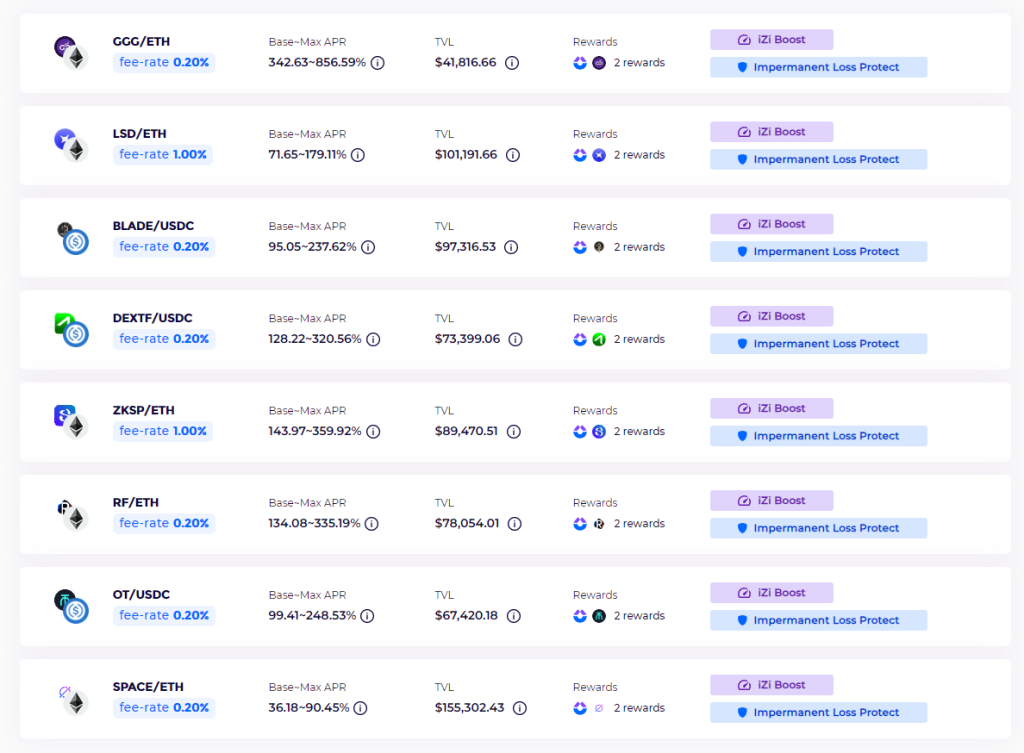 就流动性激励来说,目前 iZiswap 在 zkSync 上开启的 LiquidBox 挖矿 Pool 数量不少,全部采用了项目方代币 +IZI 代币双重激励的模式。