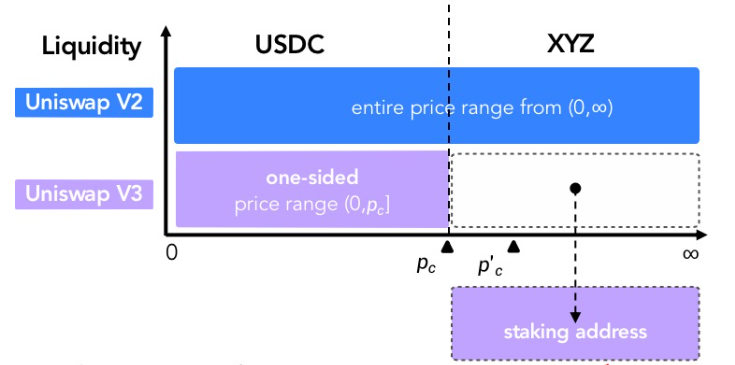 1、单边模式(oneside):用户存入的流动性中的项目代币将不会被存入 Pool,而是单独质押,以减少项目代币在池子里的数量,降低上涨时的阻力;另一半价值币(ETH 或稳定币)则会被分配在目前的代币市场价格左侧,用于加强下跌时的买盘。这对于项目方来说,实际上实现了「增加代币买盘,减少代币卖盘」的作用。对于用户来说,如果项目代币价格上涨,则不会有「一路涨一路卖」带来的无常损失。当然,如果代币下跌时,由于项目代币高位一直没有抛售,会放大用户因为下跌造成的无常损失。所以这可以理解为一种鼓励用户质押代币不卖,共同(3, 3 )的做市机制。