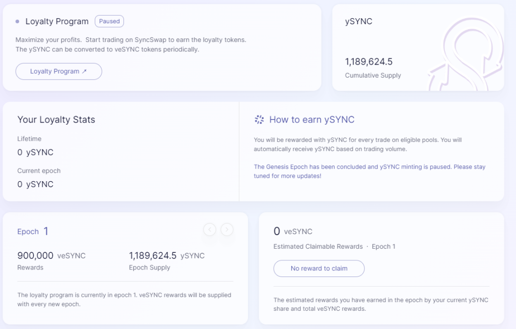 忠诚计划的创世 epoch 为今年 4 月 10 日 -5 月 10 日,总奖励为 90 万 veSYNC,最终参与用户获得的 ySYNC 为 1, 189, 624.5 ,这意味着活动期间用户在指定交易对上共支付了 1, 189, 624.5 $ 的交易费,对应 1 veSYNC 的获得成本≈ 1.32 $。