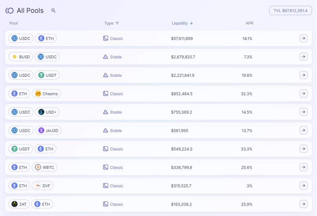 Syncswap 的流动性总量为 6761 万 $,其中 ETH-USDC Pool 就占到了 5761 万美金,占比 84.5% 。