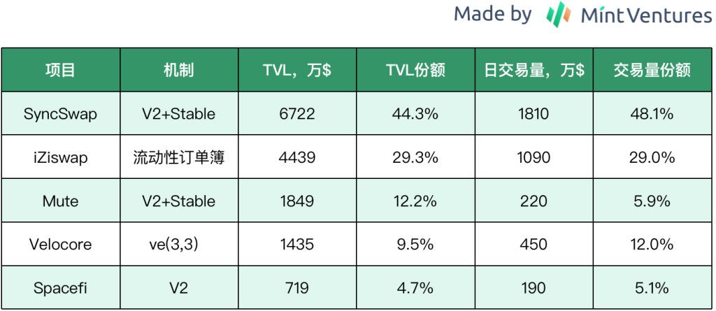 业务机制上,前 5 的 Dex 当中有 3 家(SyncSwap、Mute 和 Velocore)采用了 V2 动态池 + 稳态池的模型,其中 Velocore 还在经济模型上采用了与 Velodrome 类似的 ve(3, 3 )机制,兼营流动性市场业务。