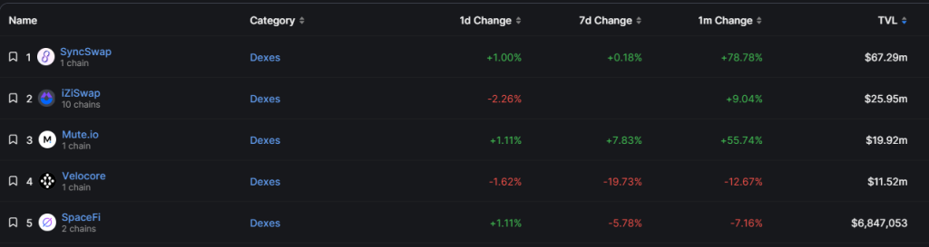 Defillama 对于 zkSync 上的 Dex TVL 统计排名