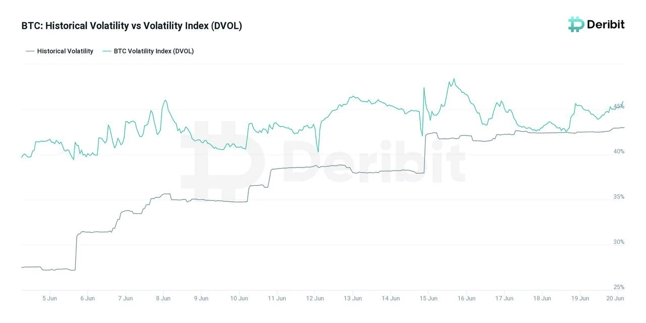 BTC 的隐含波动率已经基本等于历史波动率了,波动率溢价都没了。期权的价格现在其实很合算,适合买。
