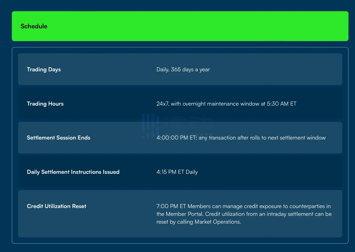 EDX 官网对平台的交易技术和市场数据有详细的描述文档,了解详情可前往 官网 查看。同时,与传统金融交易平台相似,EDX 设有相对固定的交易、结算时间,以及相对固定的交易类型。详情见下图。