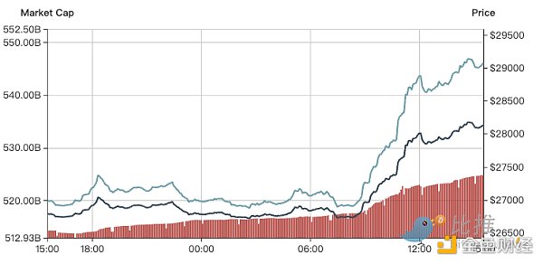 纽约时间6月20日下午,比特币突破 28,000 美元,这是自 5 月 29 日以来首次。