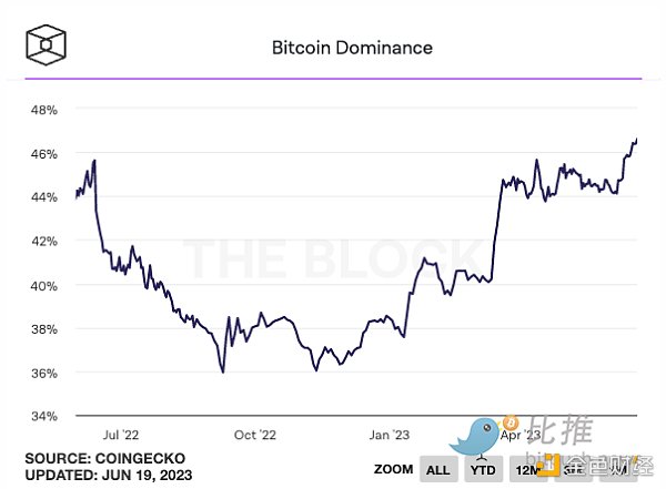 数据还显示,在美SEC对加密货币交易所币安和 Coinbase 提起诉讼并宣布多种代币为未注册证券后,比特币的主导地位升至近两年来的最高水平,为 45.84% 。上一次出现这样的水平是在 2021 年 7 月,当时达到 46.77% 的峰值。