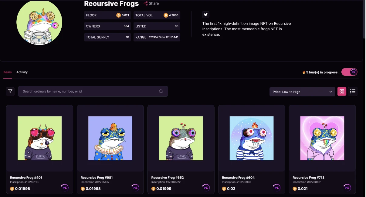 4、依赖于底层基础设施的支持:递归铭文还需要更多底层基础设施的支持,例如头部的交易所 Unisat 和 MagicEden,主要的铭文浏览器以及中心化交易所例如 OKEX、BINANCE 的支持。截至今日(2023.6.20 ),MagicEden 尚未支持上文提到的 Recursive Punks V2 版本的图片显示(如下图所示),而 Recursive Frogs 的正常展示也是在某位社区 KOL 提议后才实现。