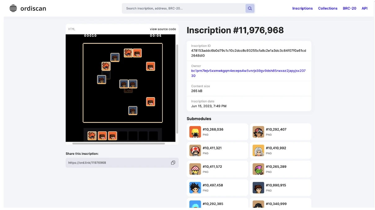 递归铭文的出现为比特链上的 GameFi 和元宇宙的实现带来了可能。目前已经出现了基于递归铭文开发的小游戏,如下图所示,这是由 Ordz Games 开发的一款递归小游戏。玩家可以直接在铭文浏览器上进行点击操作,玩法类似于之前热门的"羊了个羊",这也就是上文所提到的"网页"实现。