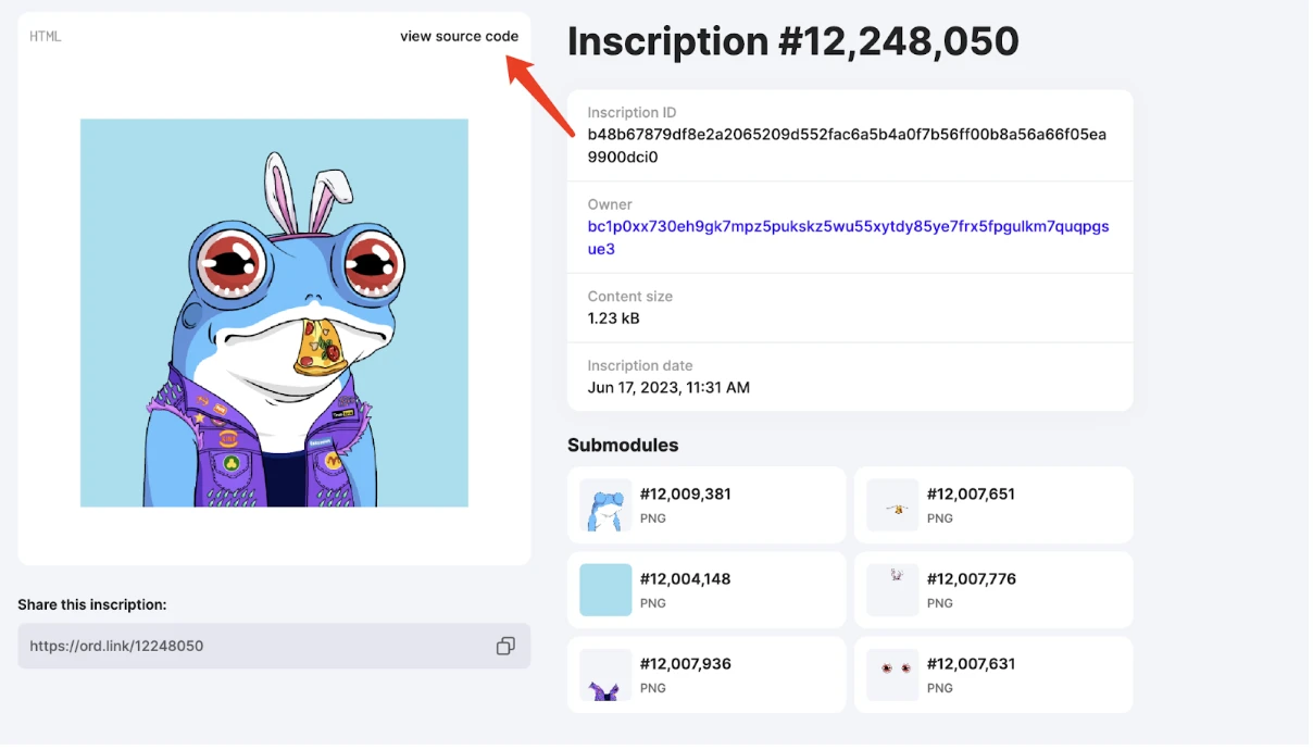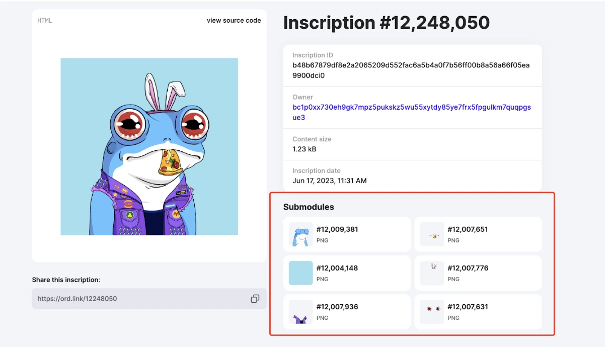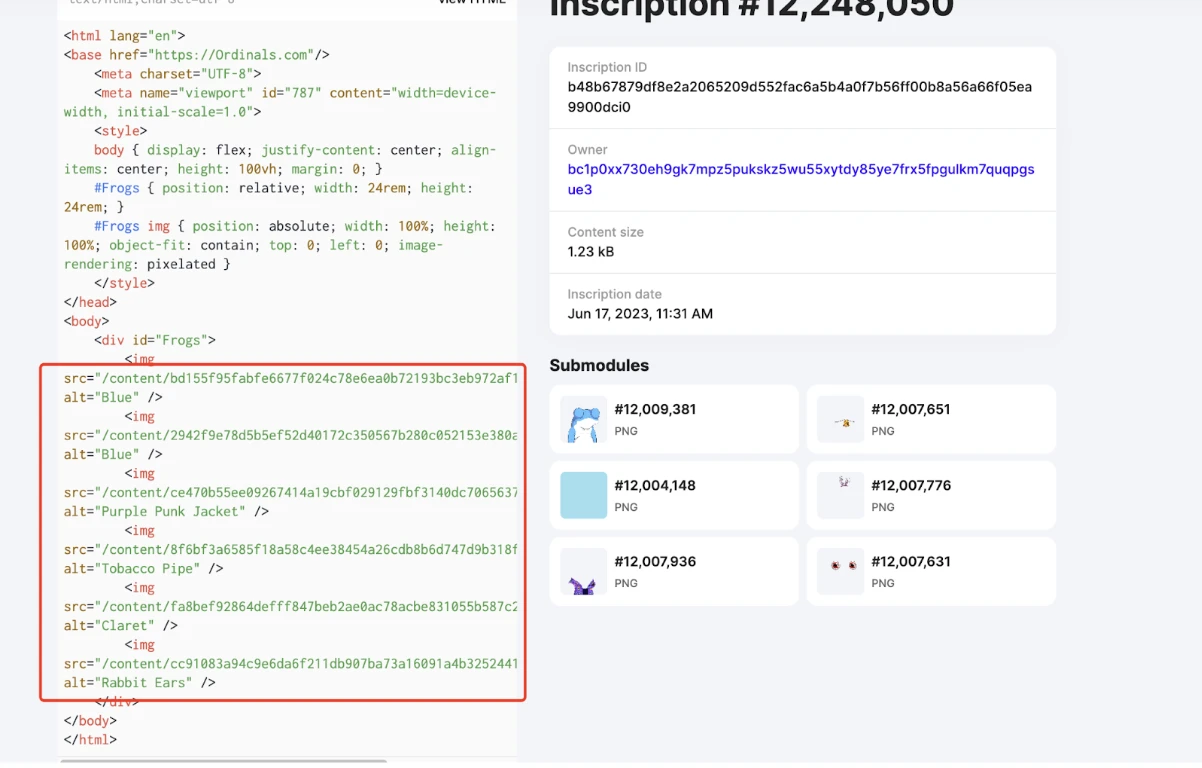 在递归铭文中,借助于上文提到的 "/content/" 语法代码,项目方得以直接引用链上已存在的 NFT 组件来创建自己的 NFT 作品。本文以递归铭文项目《Recursive Frogs》为例来说明其中的奥妙。如下图所示,红色框中展示了该 NFT 作品的组件(目前 Ordiscan 已支持递归铭文组件的显示及一键链接组件网址)。