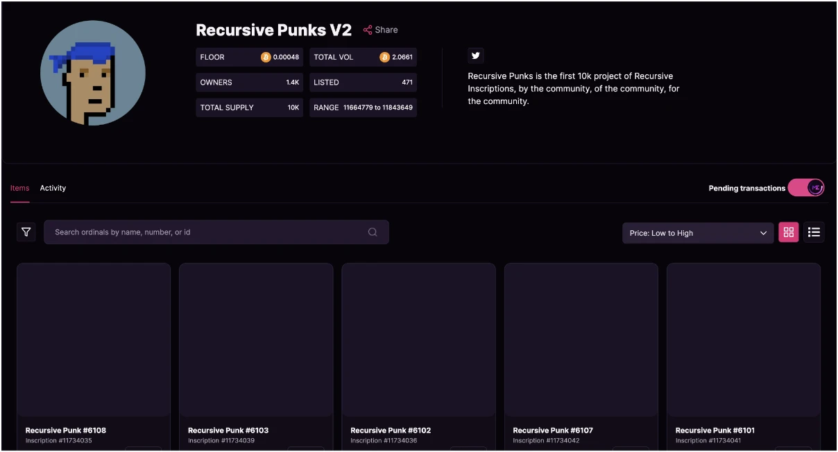 6 月 13 日,Recursive Punks 官方宣布推出免费铸造一万个 Recursive Ordinals 系列,随即引发了社区的热议和传播。由于"First is First"的原则,项目在被社区发现后迅速被刻录完,火爆之时甚至一度导致网站瘫痪。然而,随着一波狂热的 Fomo 刻录潮过后,许多用户惊讶地发现官方使用的递归铭文版本竟然是旧版的 2167 ,而正确的递归铭文语法应为 "/content/" ,官方却使用了 "/-/content/:" 。这导致了 Recursive Punks 在比特链铭文浏览器上无法正常显示图片,因此从严格意义上来说,该项目并非真正的递归铭文项目。