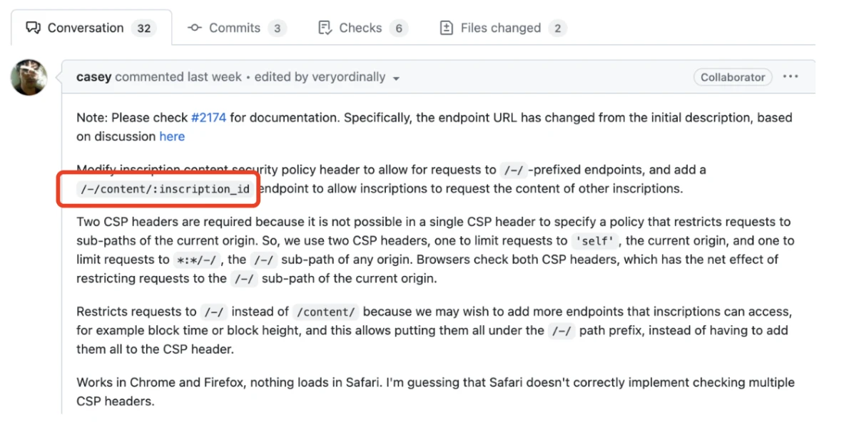 递归铭文的概念是由比特币协议 Ordinals 的创始人提出的, 2023 年 6 月 12 日,Ordinals 的新首席维护者 Raph 在 Github 上宣布了一项重要的进展,他将铭文“递归铭文”编号 2167 的创新合并到了 Ordinalsd 的代码中(如下图所示)。在这个版本的代码中,通过“/-/content/:inscription_id” 这个语法,铭文之间可以引用彼此的内容,实现了超越 Gbrc 721 的功能,这个创新直接在链上实现,无需依赖链下解析,从根本上解决了 Gbrc 721 的问题。因此,递归铭文诞生了,这个简单而巧妙的改动为 Ordinals 带来了无限的创造力,激发了人们的想象力。