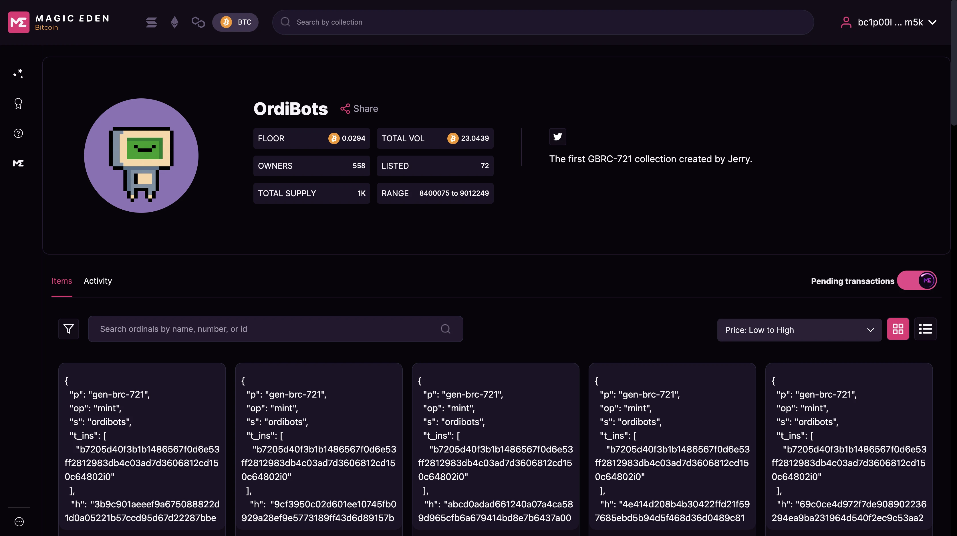 为了解决这一问题,Gbrc 721 被创造了出来,Gbrc 721 成功克服了链上高昂成本的难题。在开发 Gbrc 721 项目中,项目方只需上传 NFT 的组件,并将它们巧妙组合在一起。例如,一个 10 K 的合集可能只需要 200 个组件,这些组件包括嘴巴、耳朵、鼻子等等。这极大地节约了上链的成本。然而,这同时也带来了新的问题,即需要在链下进行图像解析以显示图片。因此,目前在 MagicEden 上展示的 Gbrc 721 项目 "Ordibots" 仍以一串文本的形式呈现(如下图所示)。
