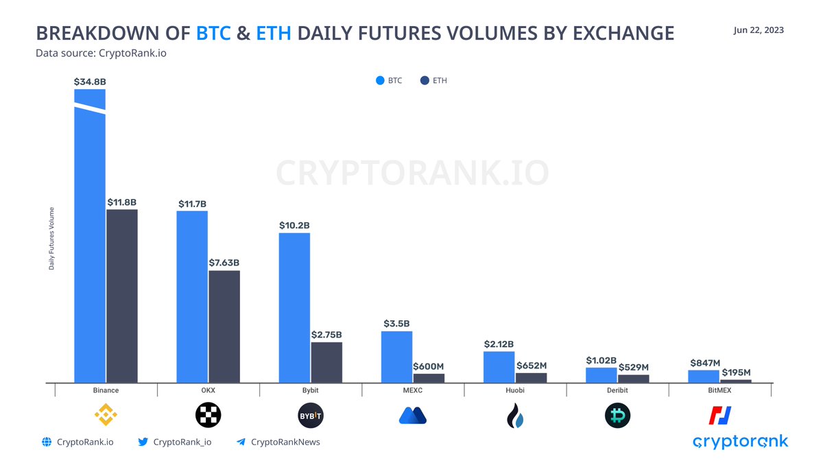 币安是所有平台期货中交易量最多的, 比特币 、 以太坊 期货交易量分别是348亿以及118亿美元。