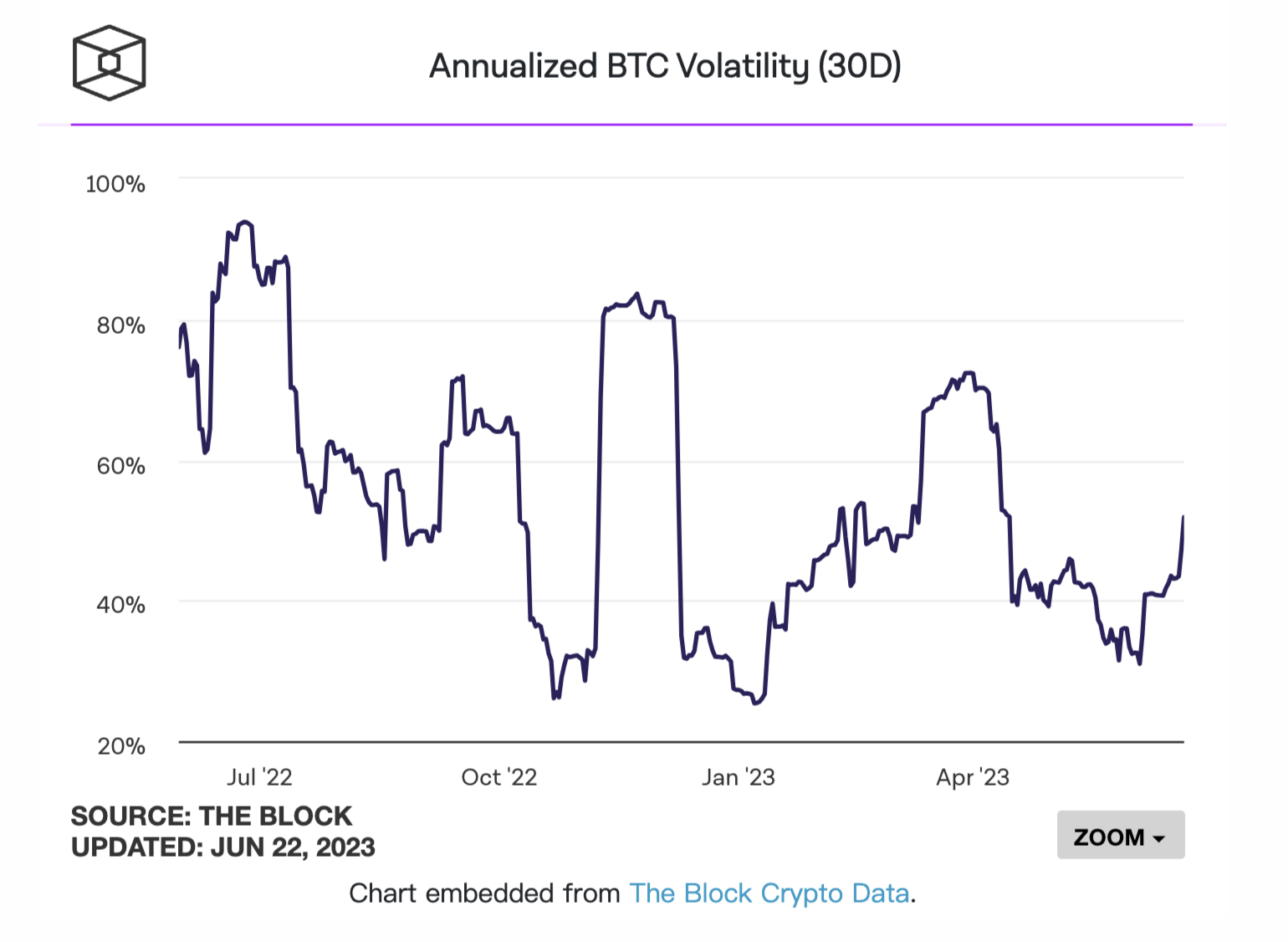 比特币的年化波动率一直在飙升,6月21日达到51.8%,高于6月6日约31%的近期低点。