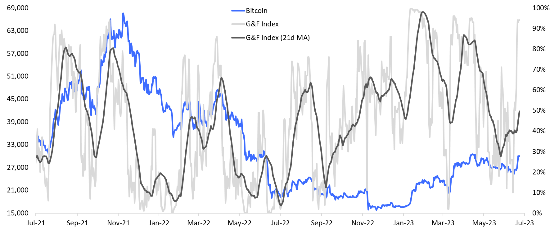从历史上看,高于90%的指数与比特币价格的临时顶部相吻合,低于10%的指数预示着价格上涨。