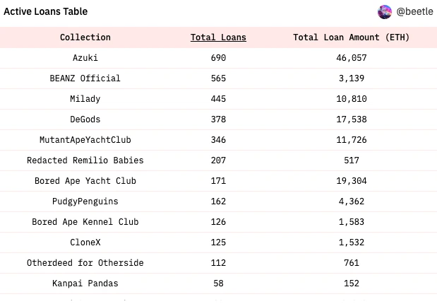 从链上数据来看,人们正在为某件重大事件的发生做着准备。Azuki 和 Beanz 在 Blend 的活跃贷款列表中名列前茅,分别有 690 笔和 595 笔贷款。这代表存在着相当大的杠杆。