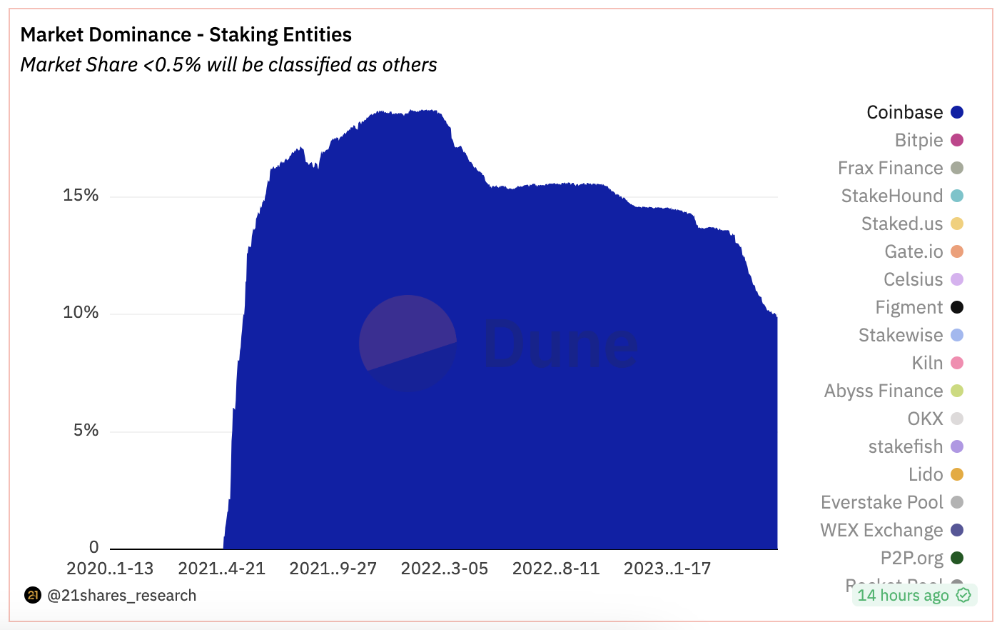 博链财经BroadChain获悉,6月24日,据CoinDesk,据21Shares的Dune数据显示,由于美国监管机构对 Coinbase 质押服务施加的压力越来越大。