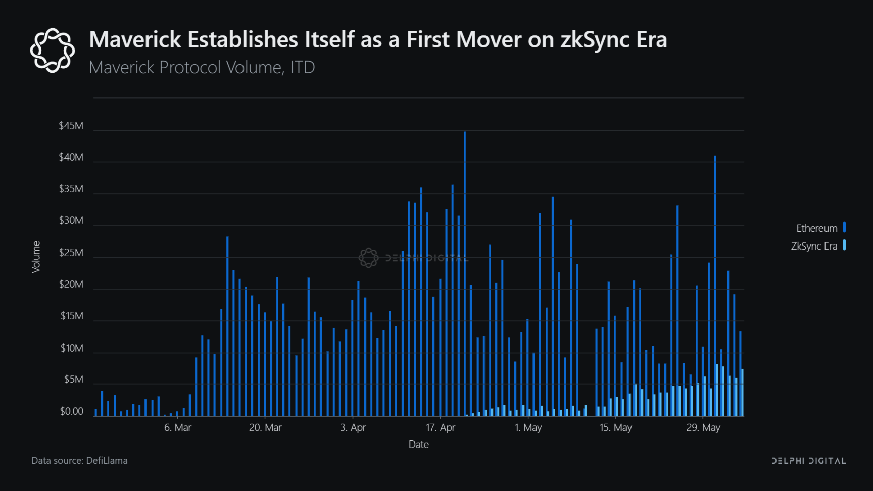 Maverick 的市场策略较为独特。在以太坊上推出后,它没有在 Arbitrum 和 Optimism 上推出,而是率先在 zkSync Era 上推出。zkSync Era 在 3 月推出,生态系统还很不成熟,但交易量正在稳步增加。
