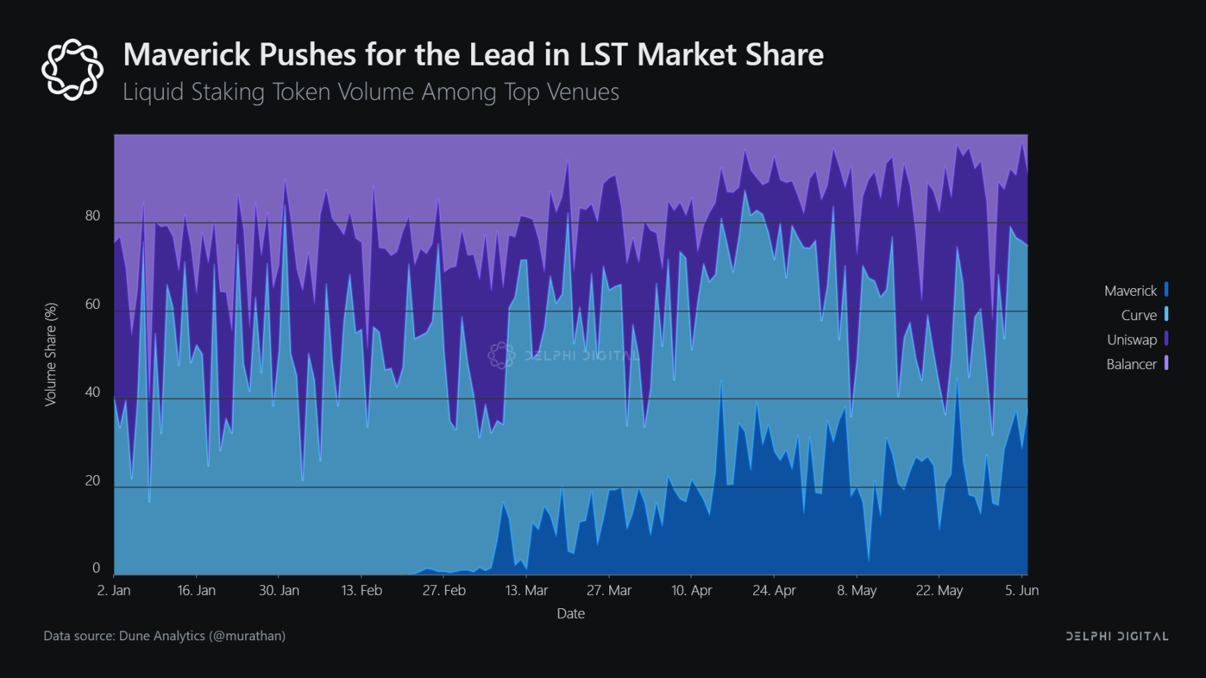 对于大多数新的 DEX 来说,最大的难点是要从 Uniswap 手中分得市场份额。Maverick 可能比大多数 DEX 更有能力与 Uniswap 竞争。在过去,成功击败 Uniswap 的 DEX(尽管时间很短)都是针对市场缝隙:Curve—稳定币;SushiSwap—流动性挖矿;Bancor—对散户的无常损失保护。Maverick 在这些方面都很出色,并且已经成为 LST 领域的重要参与者。