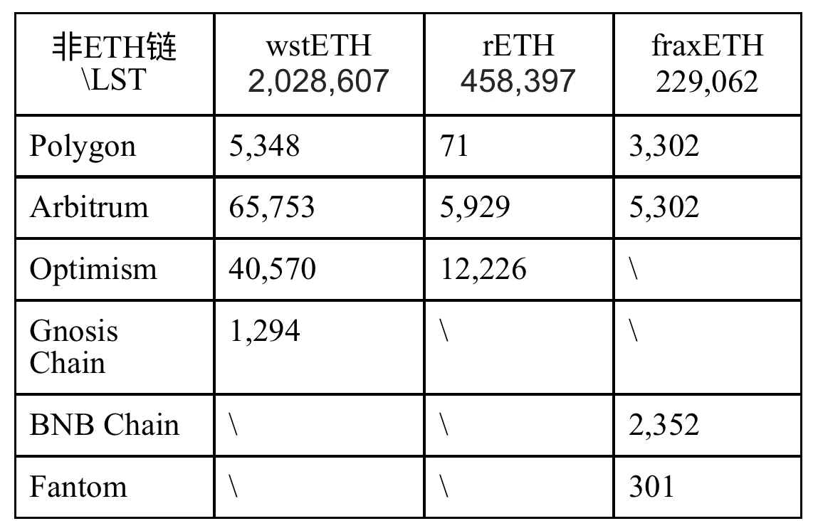 从表格中我们可以看到很多项目在L2层进行了部署,以 Top 3 去中心化质押 LST:wstETH、rETH、fraxETH 为统计。