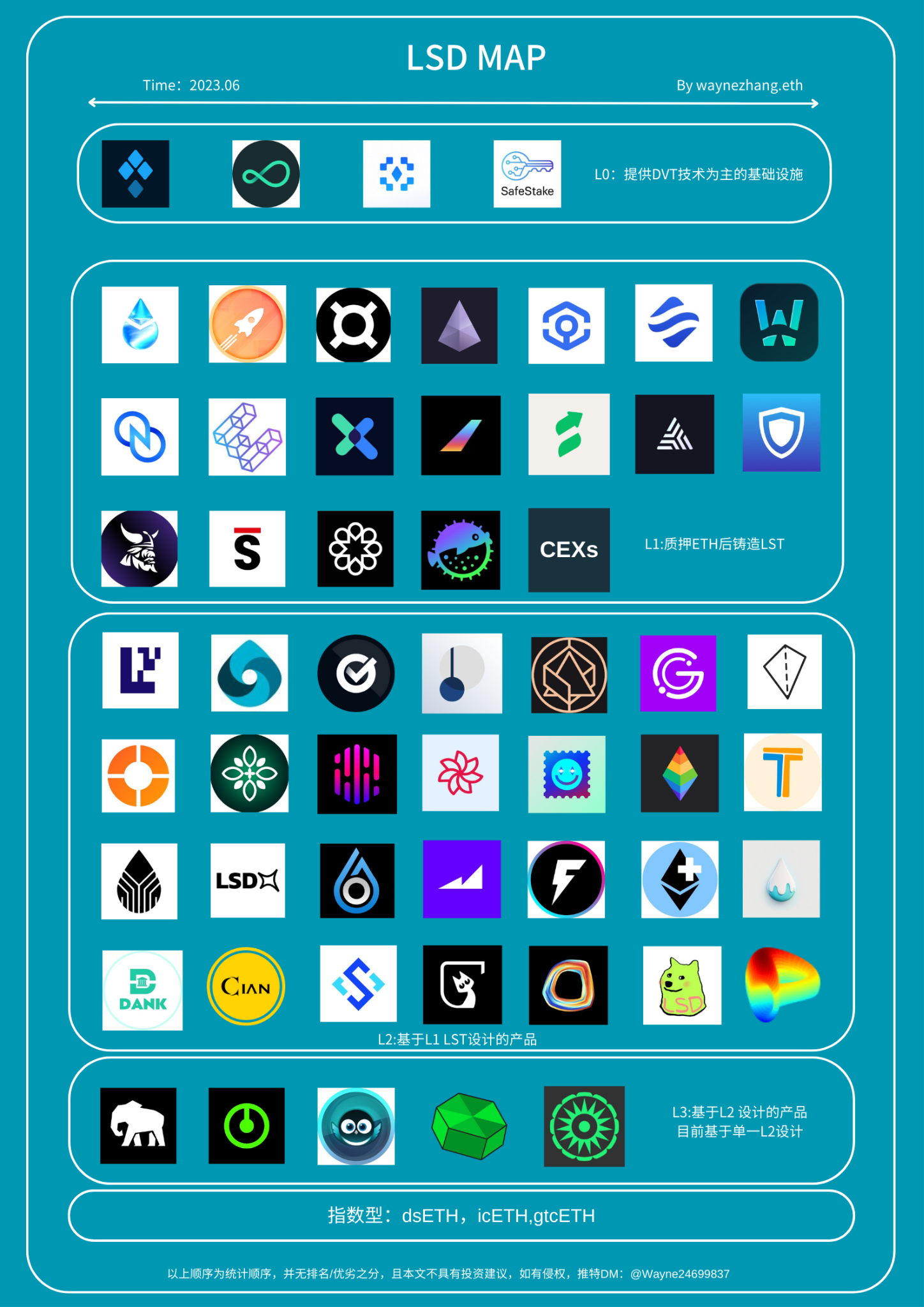 LSD 赛道已经形成初步格局。若以层级划分,SSV Network,Obol Labs 等 DVT 技术服务商可视为L0。DVT 技术可以使验证器更稳定、更安全行使签名责任。作为层级首个发行代币的项目,SSV Network 在品牌知名度方面占据先发优势。