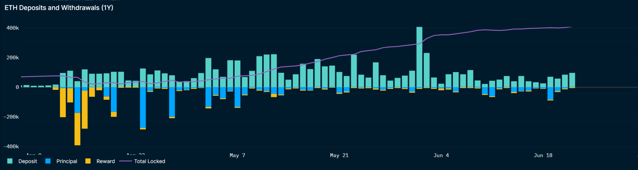 在上海升级前,预测结果是一波推出之后回暖进行第二波质押率下跌,但结果并非如此,在上海升级后,接触质押的最大的两波一次是质押奖励收取然后继续质押,一波是本金(主要来源于 CEX)解除质押,随后开始稳步上升,五月中旬质押量突破 20 M,六月突破 16% 。