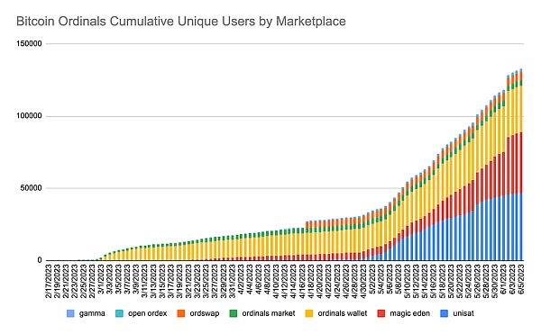 按市场划分的Bitcoin Ordinals 累积唯一用户数
