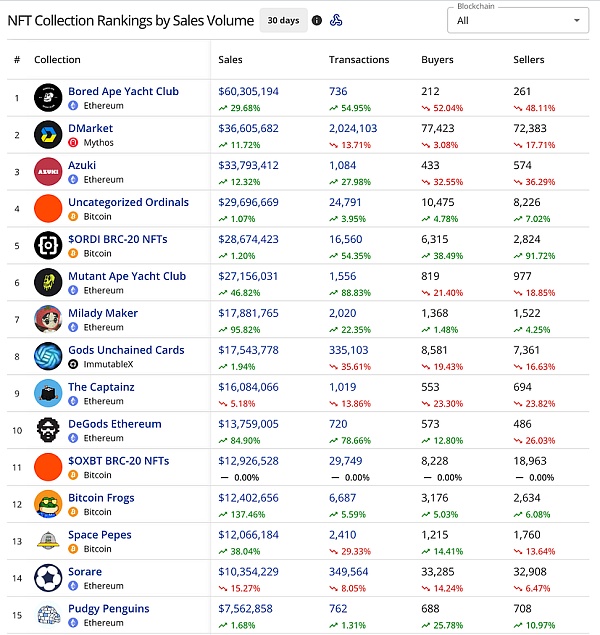 在检查上个月按销量排名前 15 的 NFT 系列时,值得注意的是,其中 5 个属于序数项目,包括两个 BRC-20 序数。