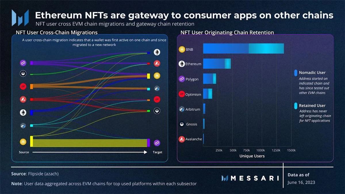 为了提供无缝的用户体验,除了传统的 NFT 市场之外的消费应用程序需要高吞吐量和低 GAS 费用。针对这种需求,许多这些应用程序已经寻求 Layer-2 扩展解决方案和侧链。这种转变促使基于以太坊的 PFP 交易者探索新的链路,大约 80% 的用户在不同的网络之间表现出“游牧”行为。